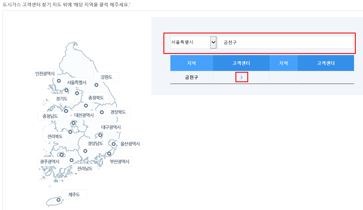 해당지역을 클릭 혹은 오른쪽 빨간색박스에 해당하는 지역을 선택한후 화면에 나오는 고객센터 숫자를 클릭합니다.
