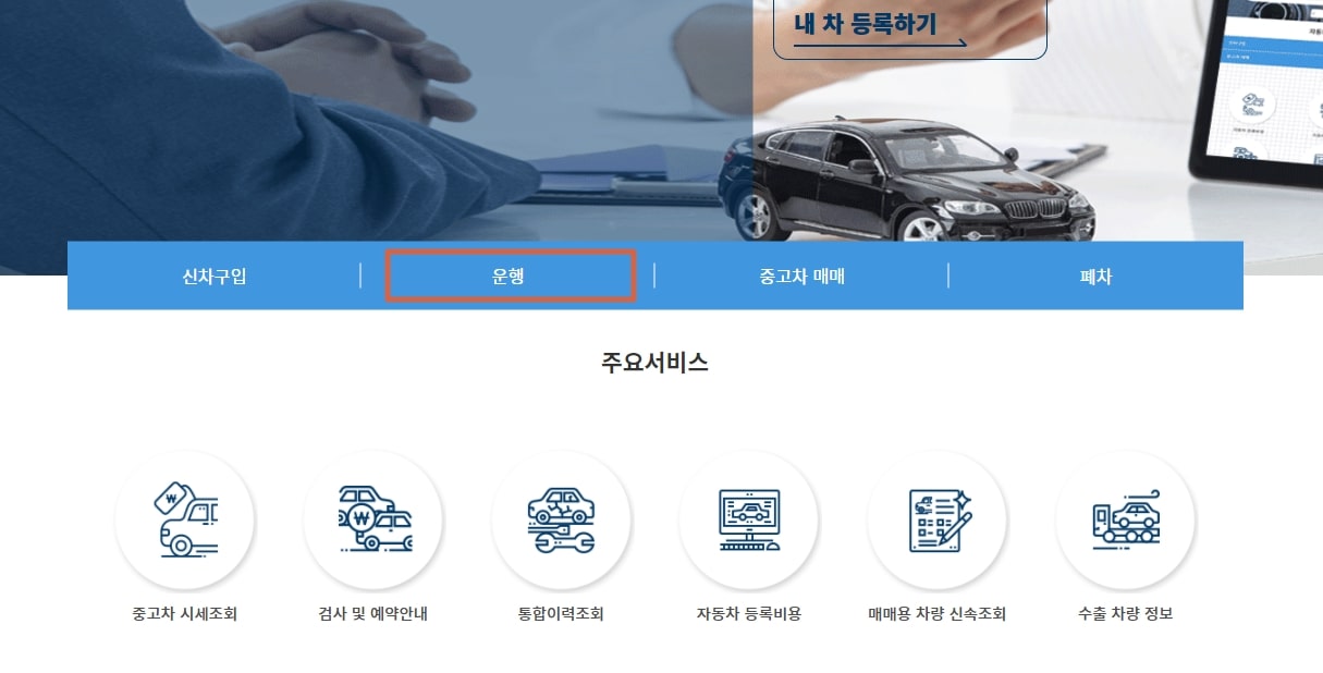 자동차 365 사이트 접속을 하시면 아래와 같은 화면을 확인할 수 있는데요. 자동차 생애주기별 서비스 항목 가운데 '운행'을 선택하고 다음페이지로 이동해 주시면 됩니다.