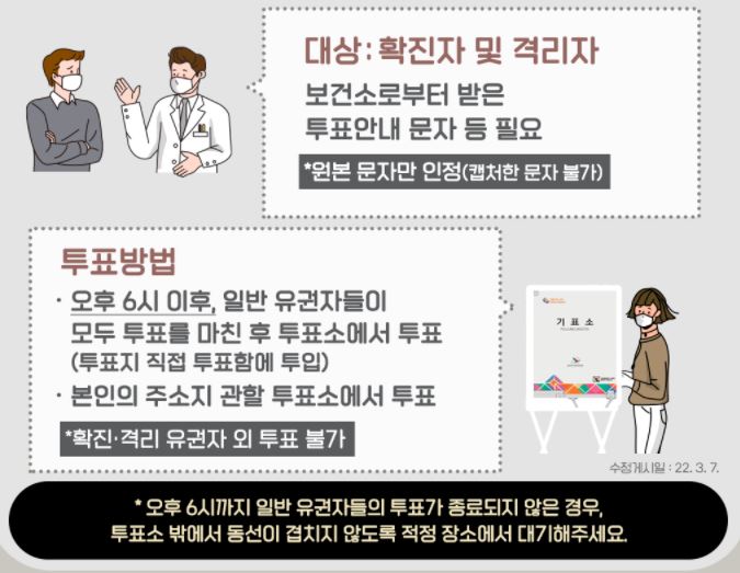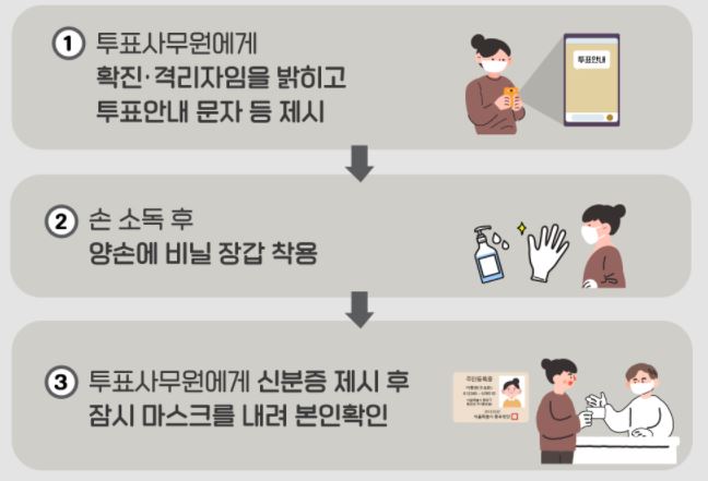 코로나 확진자의 경우 일반인과 같이 6단계의 절차를 거쳐 투표를 완료해 주시면 되기 때문에 자세한 내용을 확인해 보시길 바랍니다.