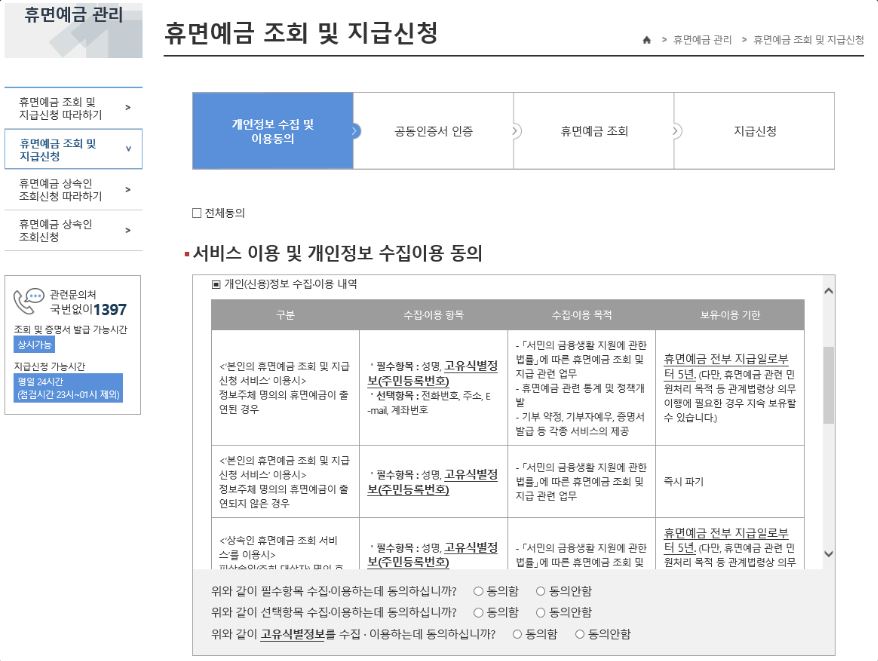 그 다음으로 아래를 보시면, 휴면계좌 조회 및 지급신청 단계를 확인할 수 있는데요. 개인정보 수집 및 이용에 동의 후 절차대로 진행해 주시면 됩니다.