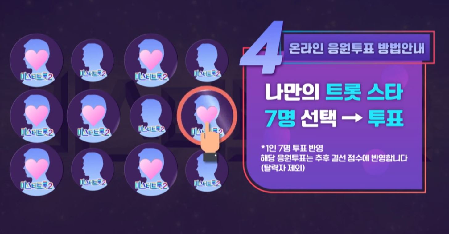 자신이 응원하는 나만의 트롯 스타 7명을 투표해주시면 됩니다.
