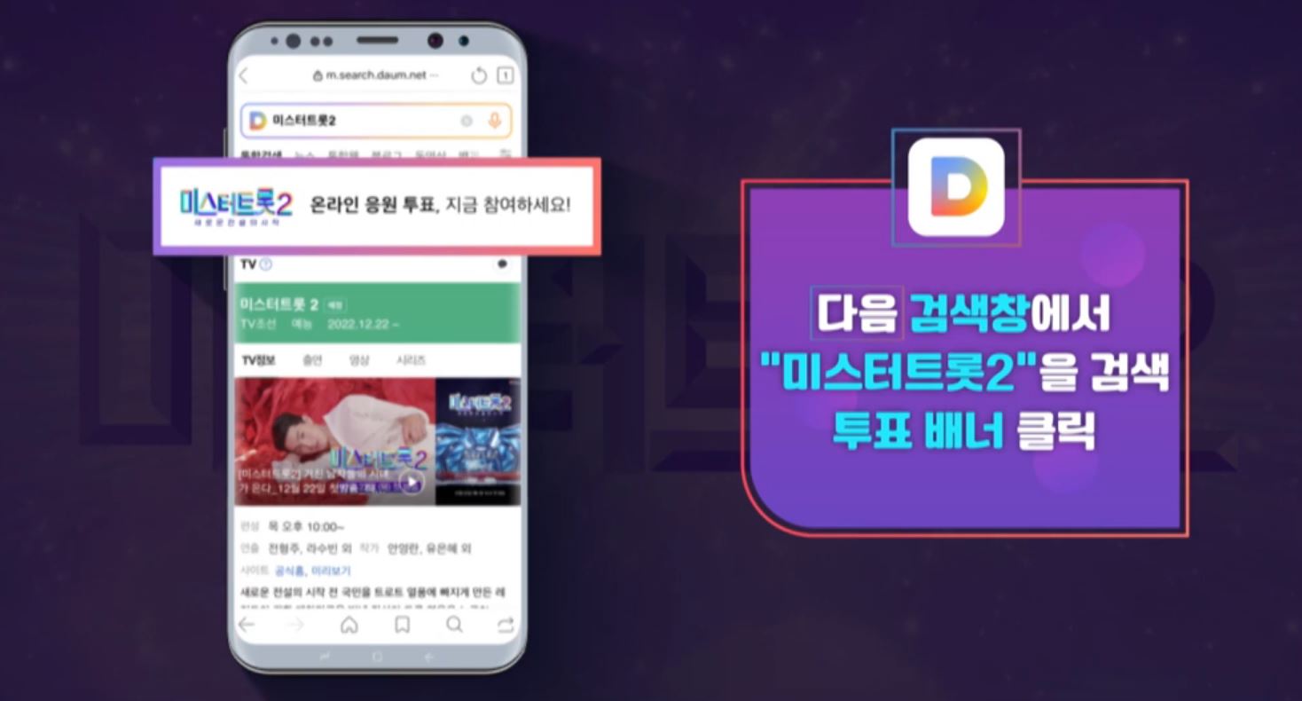 다음포털을 접속하여 검색창에서 "미스터트롯2"를 검색하시고, 투표 배너를 클릭해 주시면 됩니다.