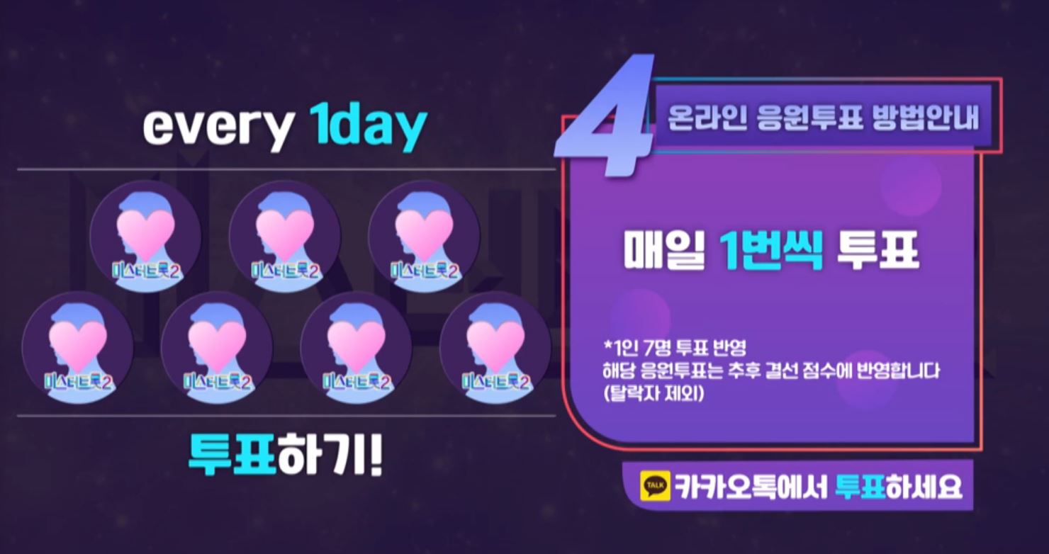투표는 매일 1회씩, 1인 7명에게 투표를 할 수 있습니다.