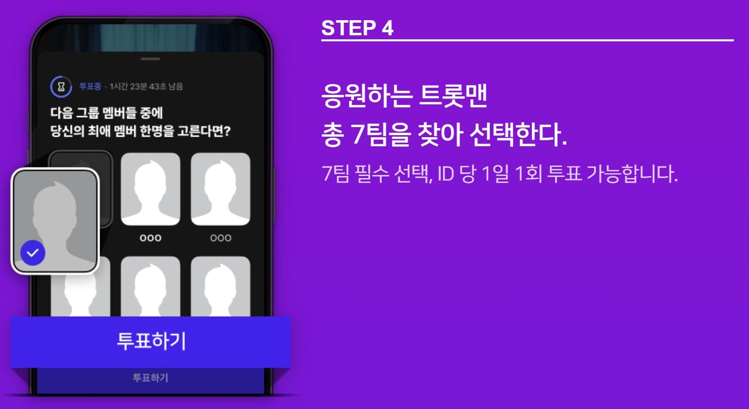 불타는 트롯맨 참가자 중 7명에 대하여 필수 투표를 하셔야 하며, ID당 1일 1회 투표가 가능하다는 점 미리 숙지하시기 바랍니다.