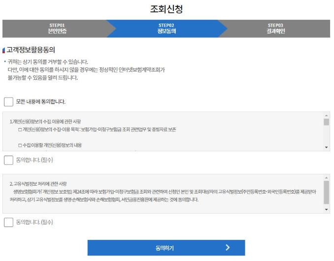 본인인증을 위한 정보를 입력한 후 그 다음으로 아래의 개인정보 활용에 대한 동의를 진행해 줍니다.