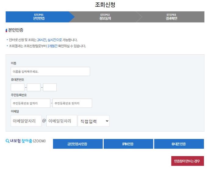 그 다음으로 아래와 같이 숨은 보험금 조회를 위한 절차가 진행되는데요. 먼저, 본인인증 단계에서 본인의 이름, 휴대폰번호, 주민등록번호, 그리고 이메일 등의 내용을 입력해 줍니다.