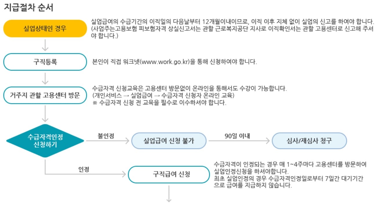 때문에 실업급여 신청이 늦어질 경우 실업급여 수급기간이 남아 있더라도 12개월의 한도기간이 만료되면 나머지 소정급여일수는 지급되지 않으니 이직(퇴사) 후 최대한 빨리 신청하시는 것이 유리합니다.