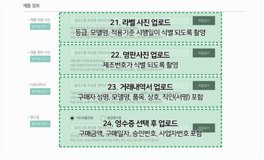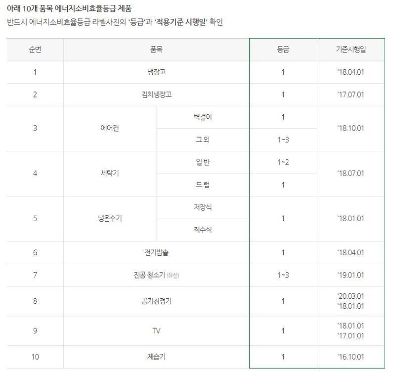 여기서 중요하게 챙겨봐야할 부분은 바로 에너지 '등급' 과 '기준시행일' 이 되겠습니다. 둘 중에 하나라도 기준에 들지 않으면 환급이 되지 않습니다.