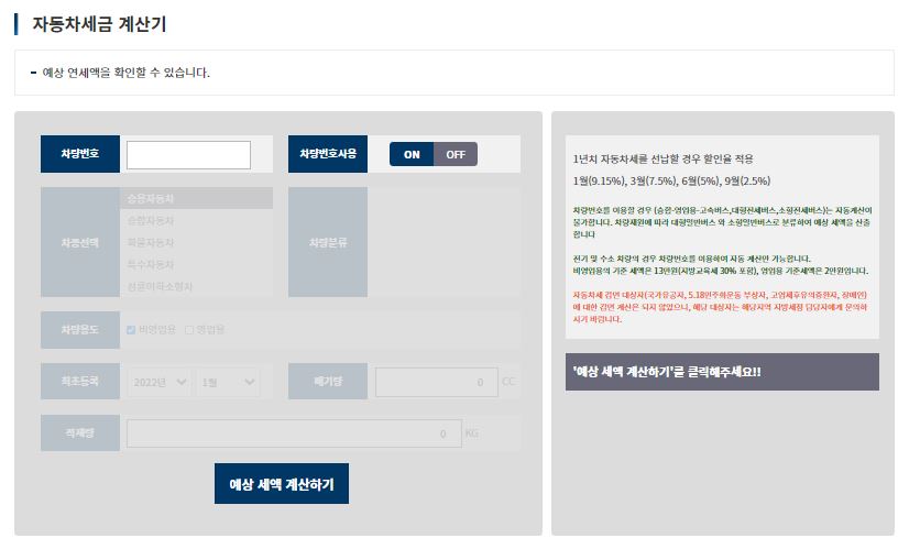 계산하고자 하는 차량의 번호를 알고 계신다면, '차량번호'를 한글포함 모두 입력해 주시면 되며 또는 자동차번호를 모르신다면 '차량번호사용' 상태를 'off' 로 해주시고 '차종선택', '차량용도', '최초등록', '배기량' 등에 대한 정보를 기입해 주시면 결과를 확인할 수 있습니다.