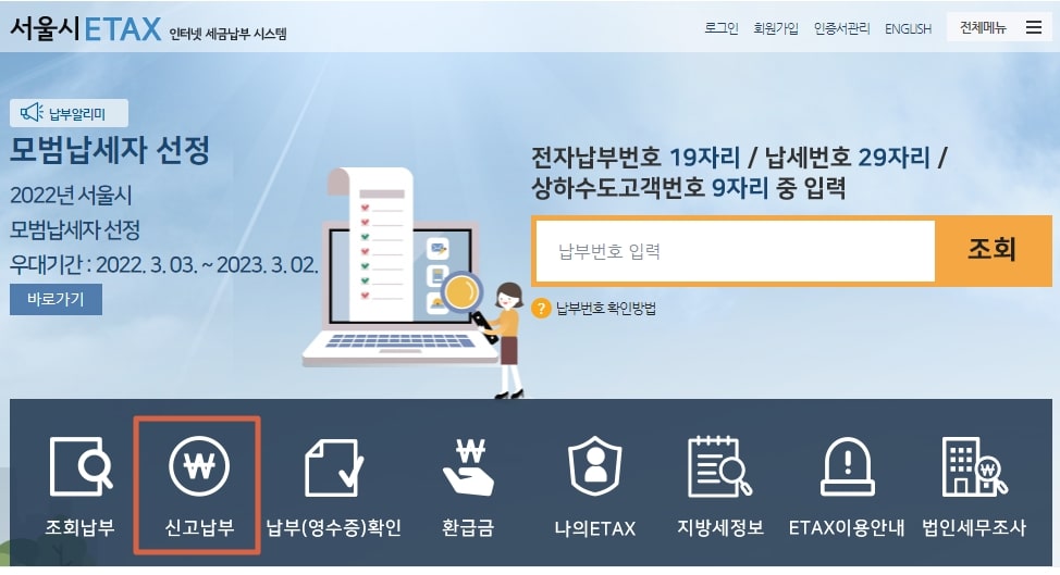 주소지가 서울시로 되어 계신분은 자동차 연납 신청방법으로 '이택스' 홈페이지를 이용하시면 됩니다. 아래와 같이 홈페이지에서 '신고납부'를 클릭하여 페이지 이동을 해주세요.