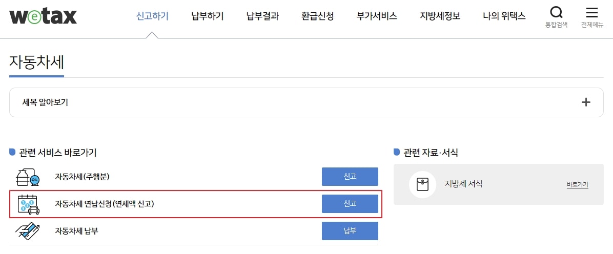 그 다음화면에서 여러메뉴 중 '자동차세 연납신청'을 선택해 주시면 됩니다.