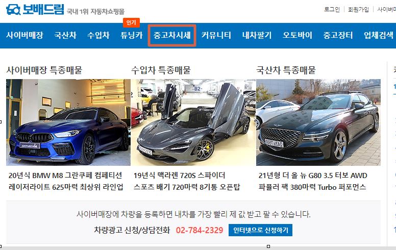 포털 검색을 통해 보배드림 사이트를 접속하시면 아래와 같은 첫 화면을 확인할 수 있는데요. 상단 '중고차시세'를 선택하여 이동해 주세요.