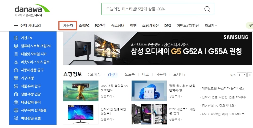 우선, 포털 사이트에서 '다나와사이트'를 검색하셔서 다나와 홈페이지로 접속 하시면 아래와 같은 화면을 확인할 수 있는데요. 첫화면에서 좌측 상단의 '자동차' 카테고리를 클릭해주시고 이동해 주세요.