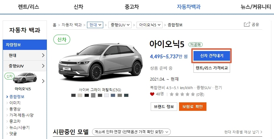 아래화면을 보시면 구매하시고자 하는 차량에 따라서 '신차'를 선택해 주시고 구입을 원하는 차량종류를 선택하시면 차량 사진 옆에 '신차 견적내기' 가 있는데요. 이곳을 클릭해주세요.