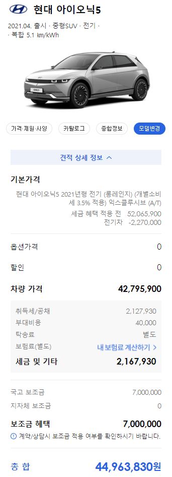다음 화면에서 아래와 같이 차량을 구매시 예상되는 취등록세 포함 가격을 확인할 수 있는데요. 국고보조금도 함께 확인해 볼 수 있어 더 편리 합니다.