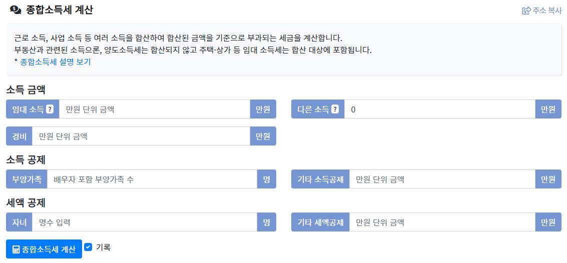 부동산계산기.COM 또한 여러가지 세금과 함께 종합소득세 계산기 서비스를 제공하고 있으니 참고해 보시기 바랍니다.