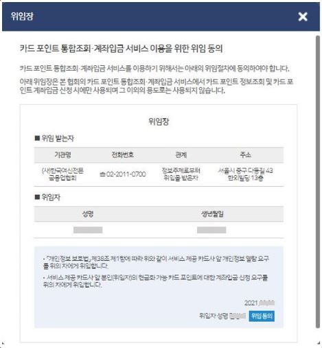 카드포인트 통합조회 및 계좌입금은 '한국여신전문금융업협회'에서 본인에게 위임을 받아 진행하는 과정이기 때문에 아래와 같이 위임에 대한 동의를 진행해 주시면 되겠습니다.