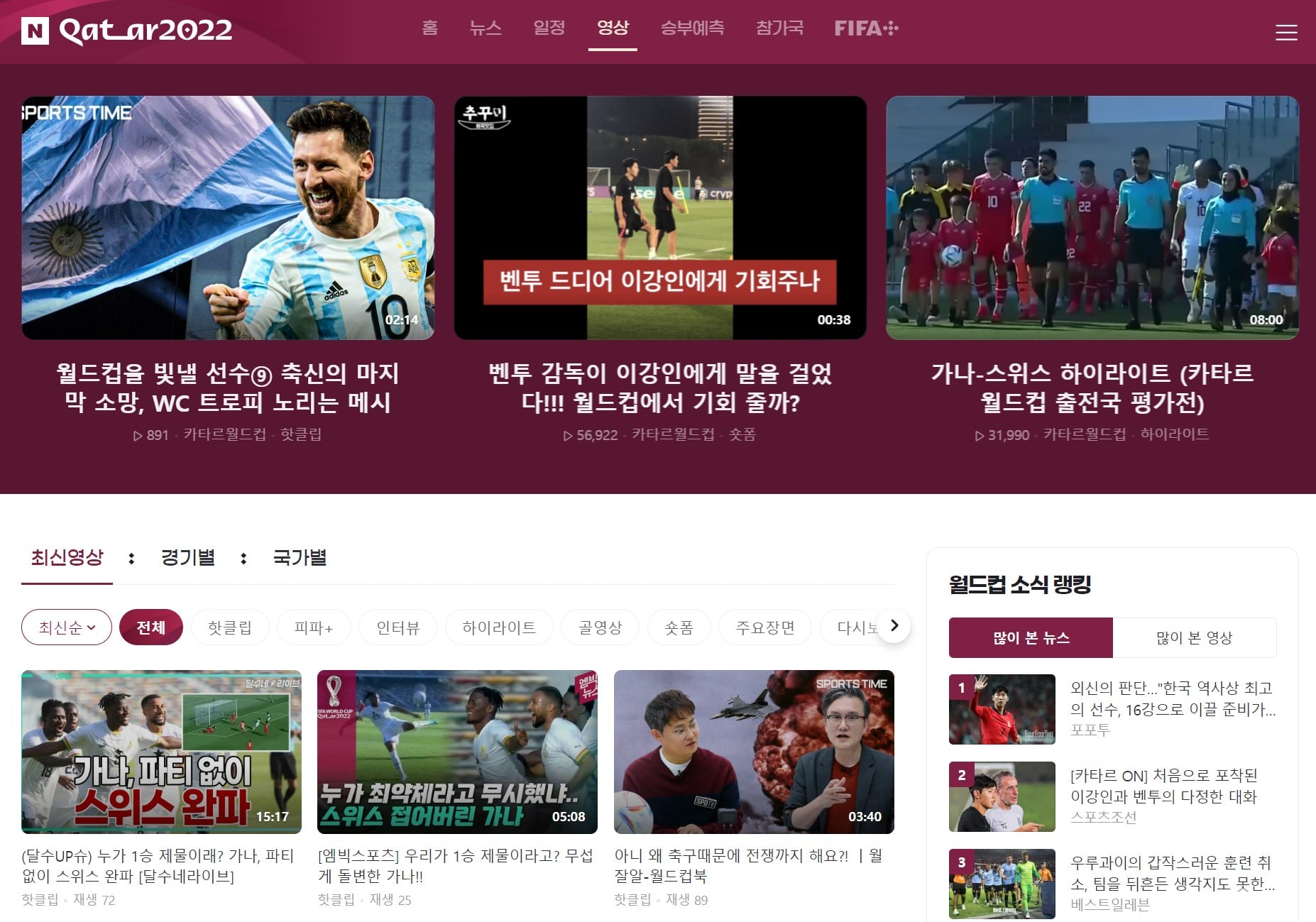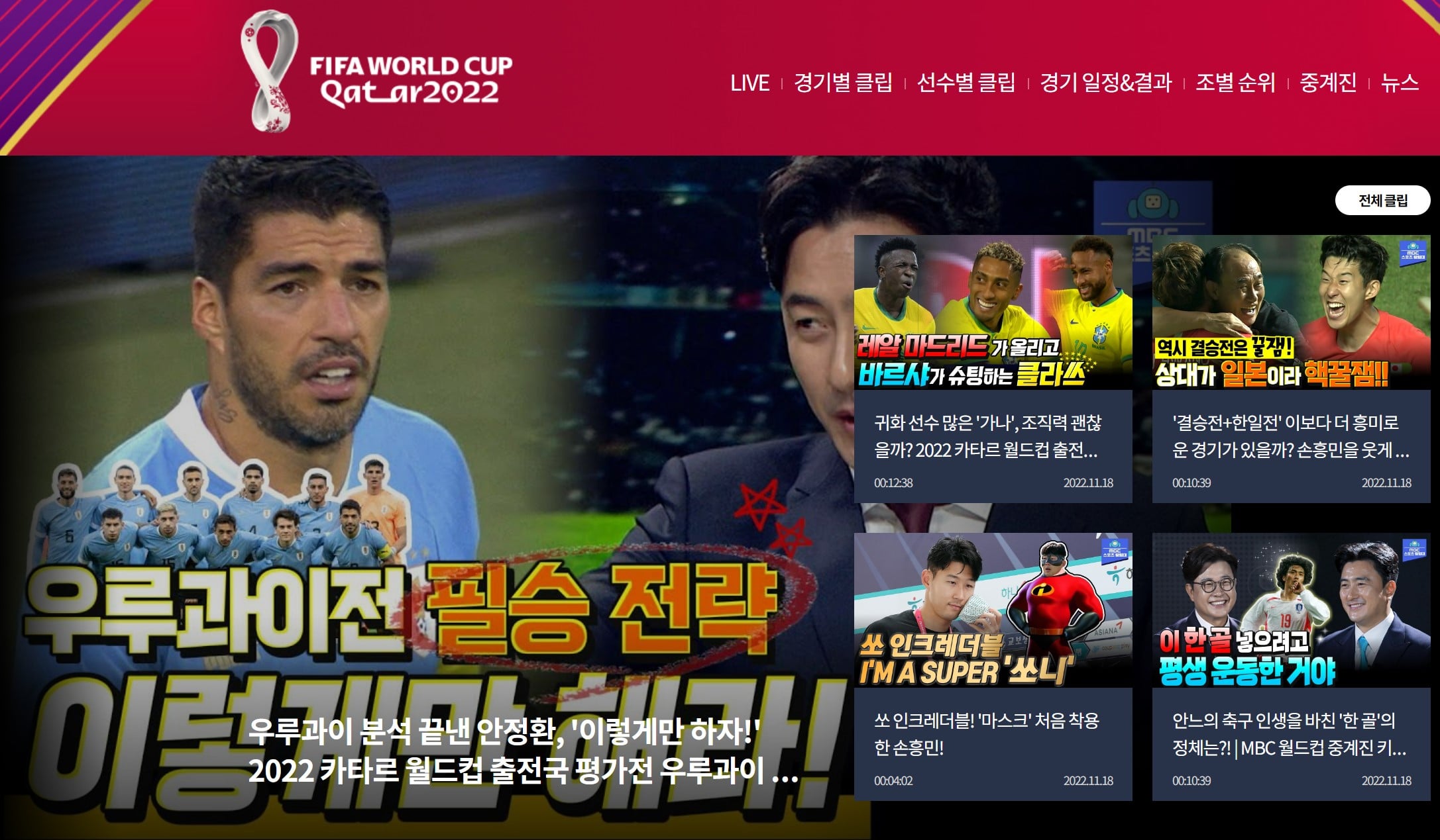 다음으로 과거 '문화방송'으로 잘 알려진 MBC 입니다. MBC가 이번에 마련한 카타르 월드컵 사이트를 보시면 특징적으로 화제의 영상들을 각 경기별, 각 선수별로 따로 모아서 볼 수 있습니다.