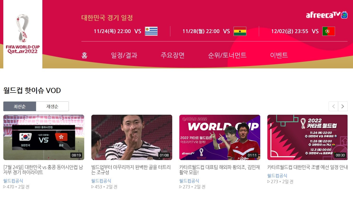 인터넷 방송의 대표 사이트인 아프리카TV를 통해서도 카타르 월드컵 중계 시청이 가능한데요. 월드컵 핫이슈 VOD와 함께 주요장면 등을 확인할 수 있습니다.