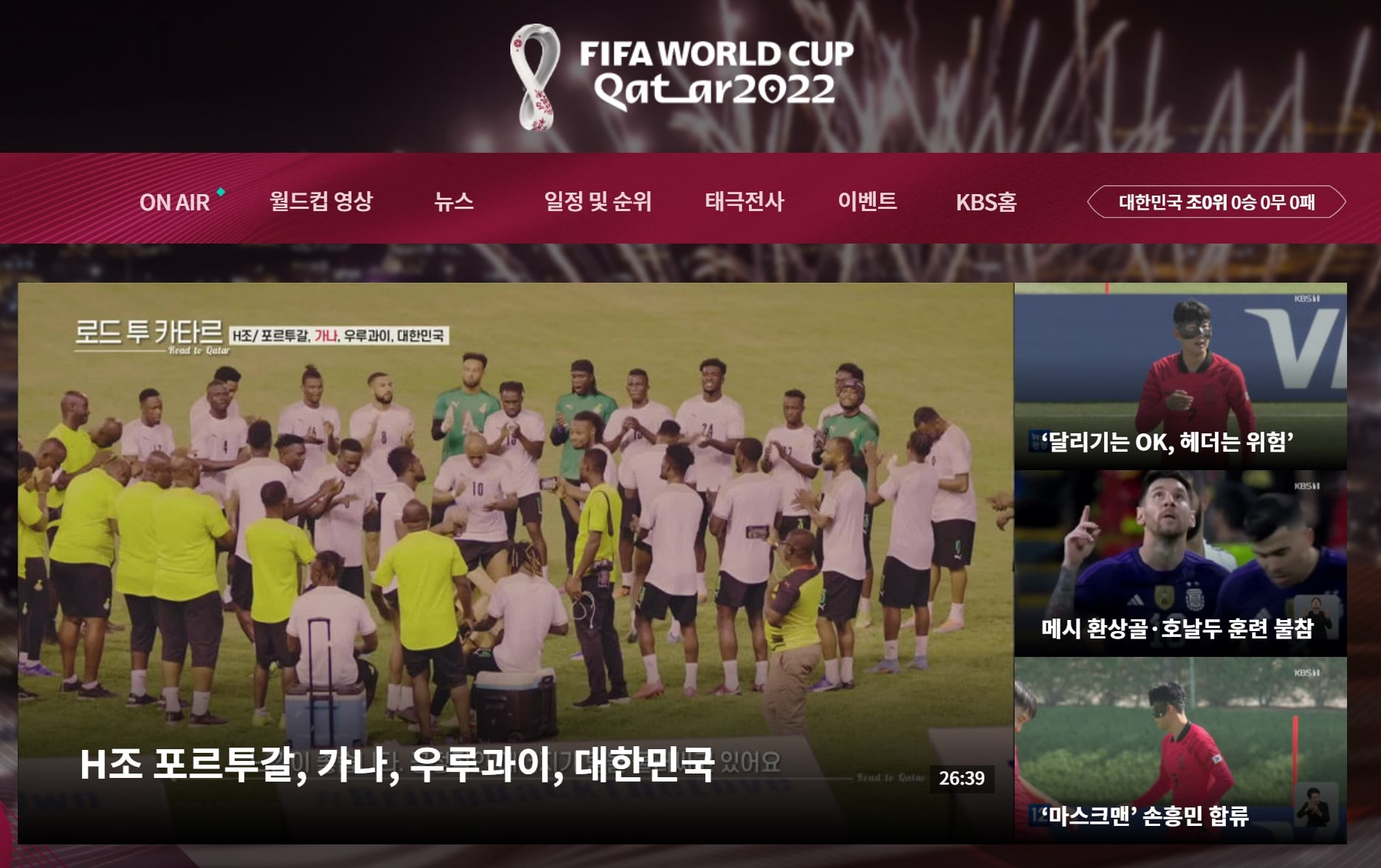 대한민국 대표 공영방송인 KBS에서는 아래와 같이 이번 2022 FIFA 카타르 월드컵을 맞아 별도 사이트를 개설한 후 실시간 화제의 뉴스와 함께 월드컵 일정, 주요영상 등의 정보를 발빠르게 전해주고 있는데요.