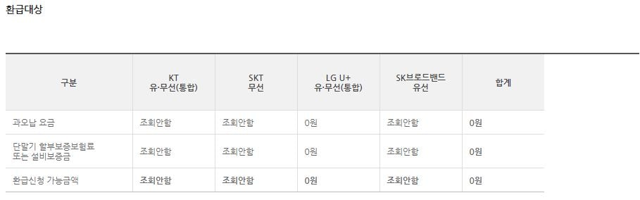아래와 같이 통신사별 과오납 요금 등의 조회 내용을 확인할 수 있습니다.