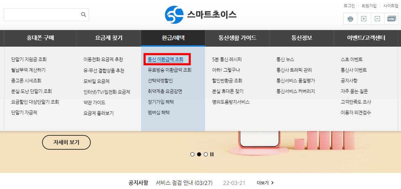 아래 '스마트초이스' 사이트를 접속하시면 하단에 '통신 미환급액 조회'를 선택하고 다음으로 넘어가주세요.