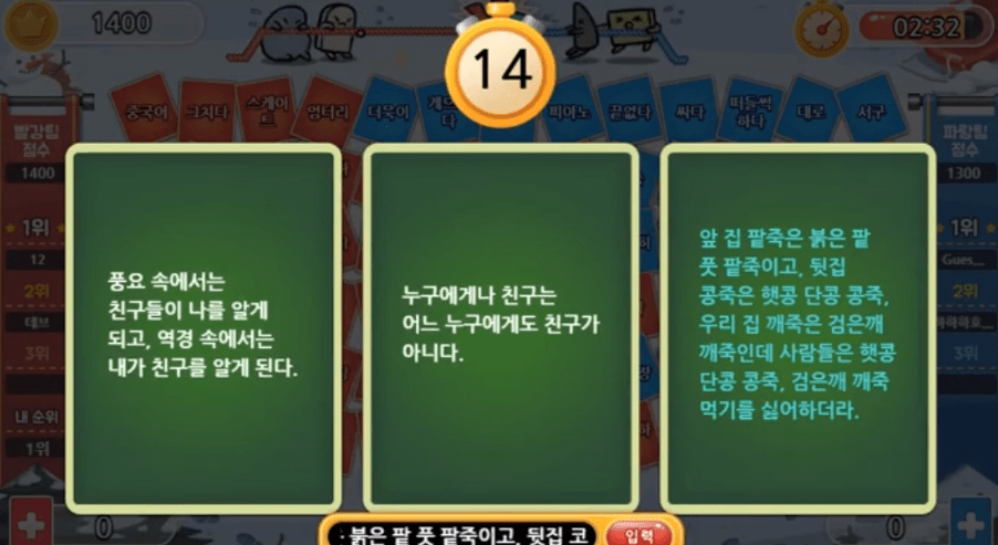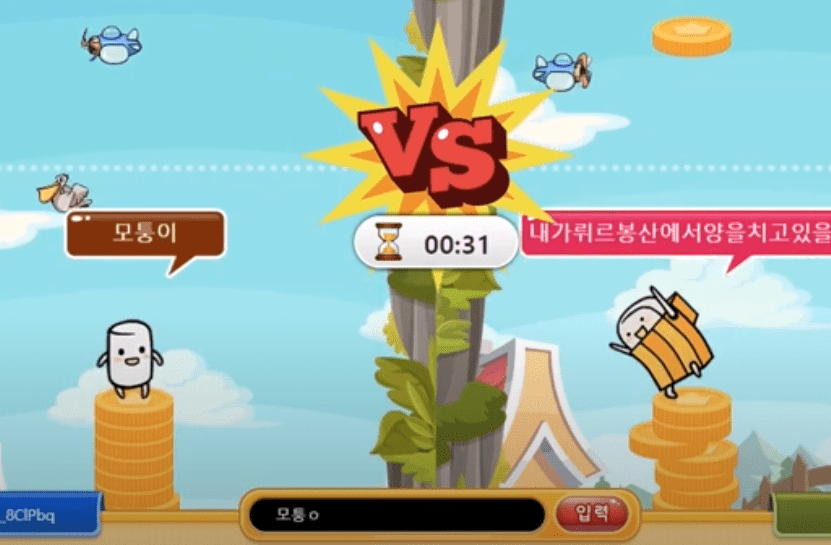 홈페이지 상단의 메뉴를 누를경우 아래에 보시는것과 같이 다양한 메뉴들이 있습니다. 짧은글과 긴글연습, 그리고 낱말, 타자게임 뿐만 아니라 두더지잡기, 동전쌓기, 판 뒤집기, 그리고 타자 연습게임으로 아주 유명한 산성비 등의 다양한 게임이 셋팅되어 있습니다. 더불어 로그인을 하여 게임을 진행할 경우 친구와 승패 전적 기록과 포인트 적립도 가능한데요. 재미있게 타자 연습을 할 수 있도록 고민한 한컴의 노력을 엿볼 수 있겠습니다.