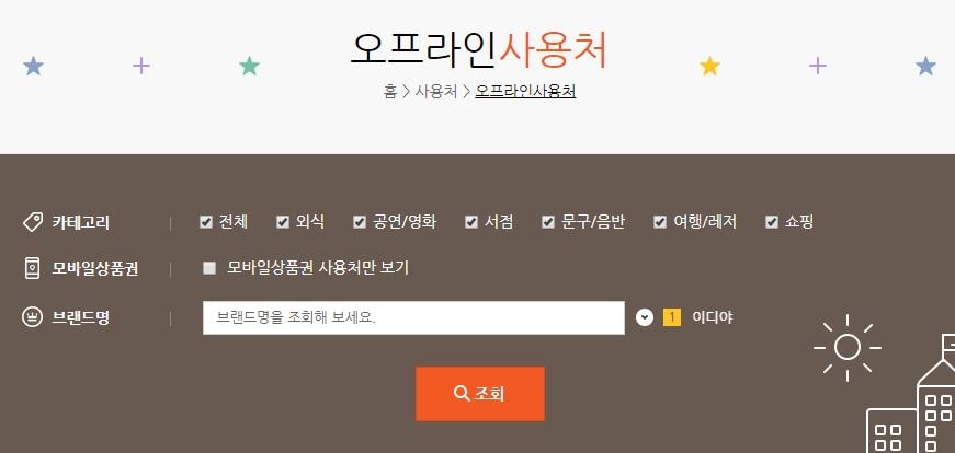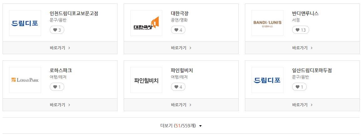 편의점 GS 25 를 비롯하여 외식으로는 아웃백, 빕스, 피자헛, 등이 있고 영화는 CGV, 멕박스, 롯데시네마 등 우리생활 속에서 접하는 대부분의 장소는 다 사용할 수 있다해도 무방할 정도로 많은 것을 확인할 수 있습니다.