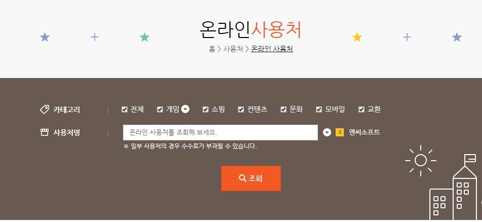 아래 보시면 역시 아래와 같이 게임, 쇼핑, 컨텐츠, 문화, 모바일, 교환 등의 카테고리를 확인하실 수 있는데요. 온라인 역시 사용할 수 있는 분야가 매우 많습니다.