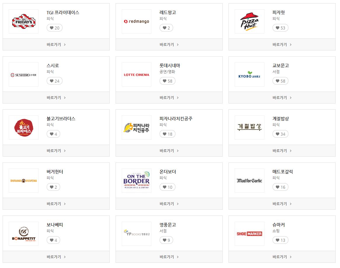 편의점 GS 25 를 비롯하여 외식으로는 아웃백, 빕스, 피자헛, 등이 있고 영화는 CGV, 멕박스, 롯데시네마 등 우리생활 속에서 접하는 대부분의 장소는 다 사용할 수 있다해도 무방할 정도로 많은 것을 확인할 수 있습니다.