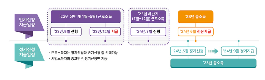 2024 근로장려금 신청은 정기신청/지급, 그리고 반기신청/지급 방식이 있습니다.