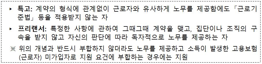 - 예술인 또는 노무제공자 고용보험 가입자의 경우 지원 대상에 포함 되나, 예술인 또는 노무제공자 고용보험 가입자라도 근로자 고용보험과 이중으로 가입된 경우는 지원 대상에서 제외